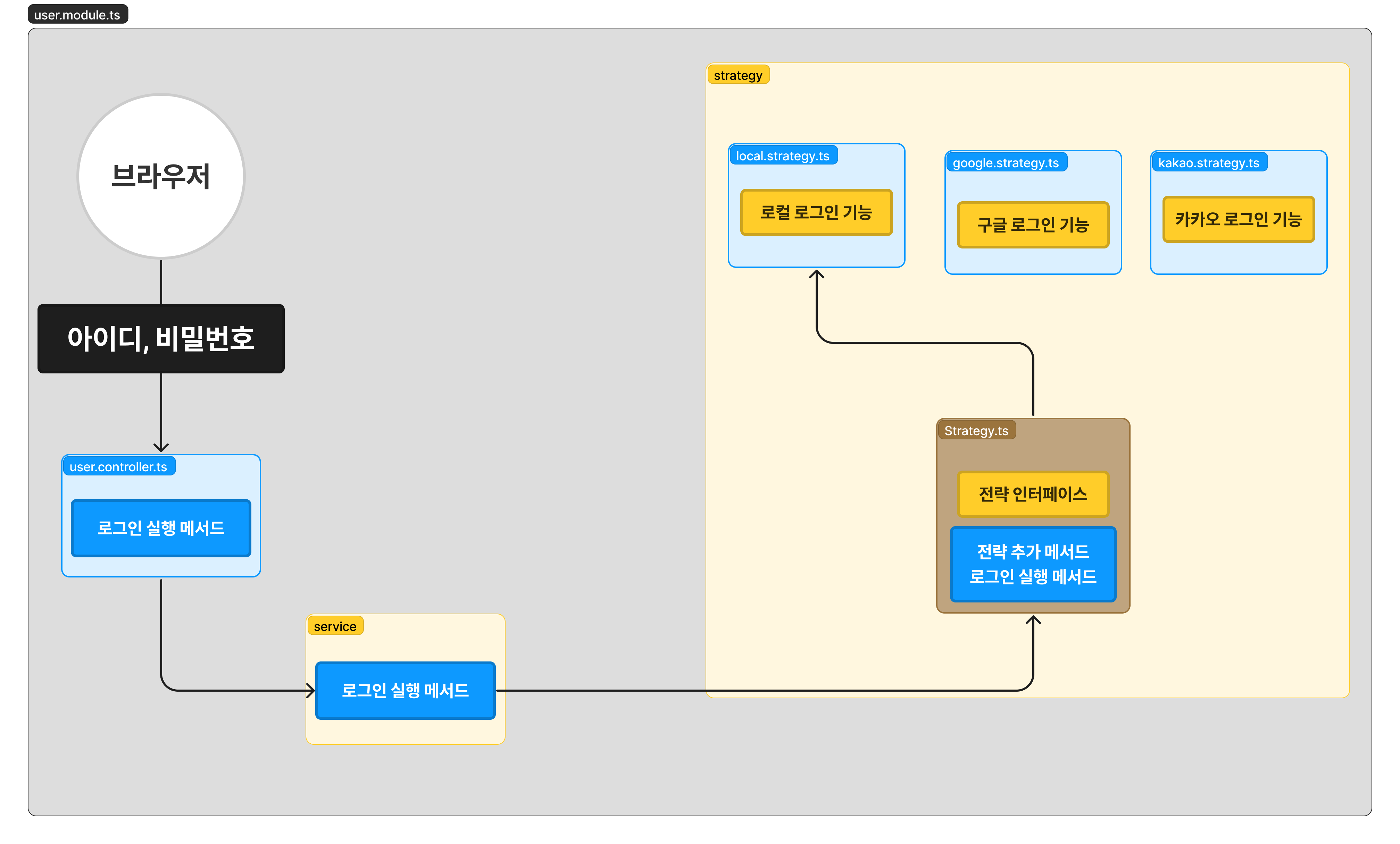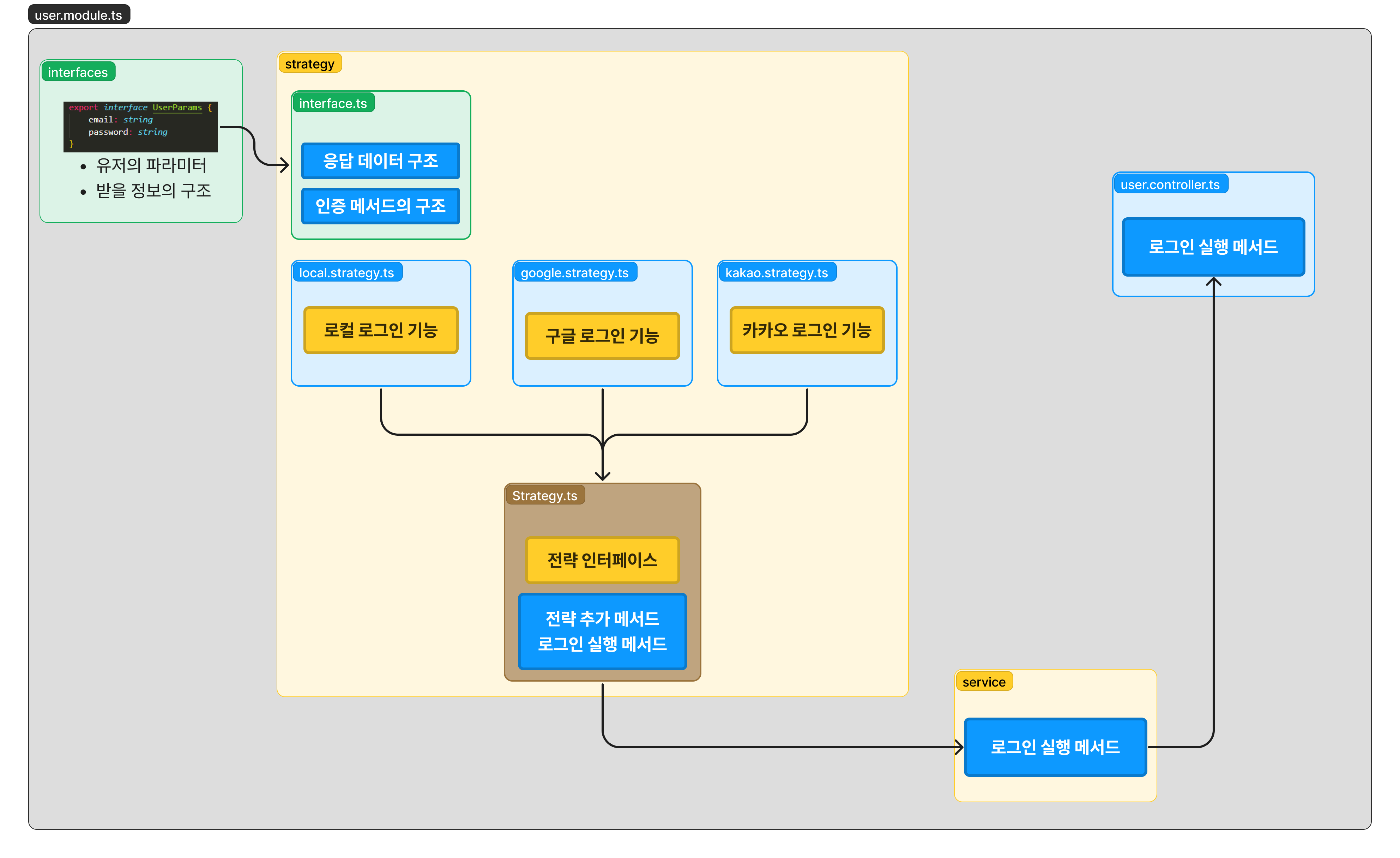 여기서 각 로그인(로컬, 카카오, 구글)의 로직은 각각의 클래스로 구현하고