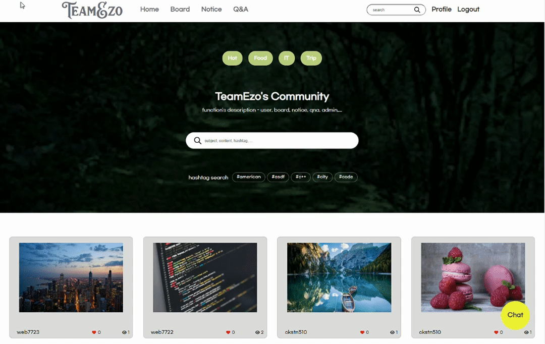 기본적으로 회원가입, 로그인, 글쓰기(CRUD), 실시간 채팅, 회원관리 등의 기능이 구현되어있는 사이트를 만드는 것을 목표로 작업했다.